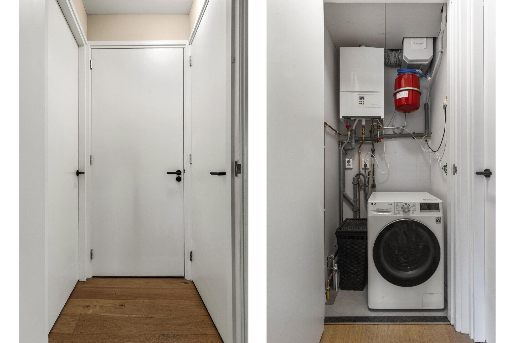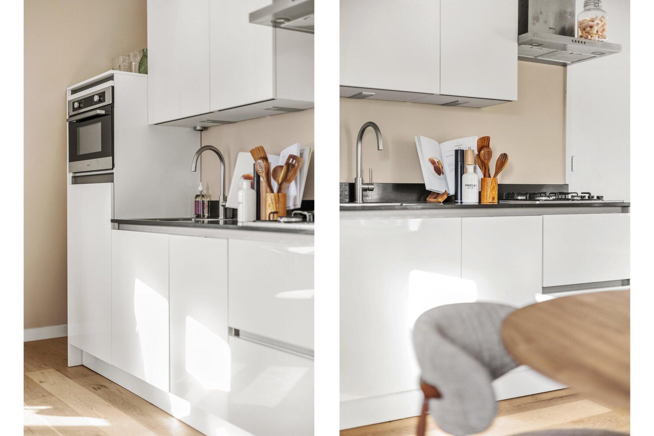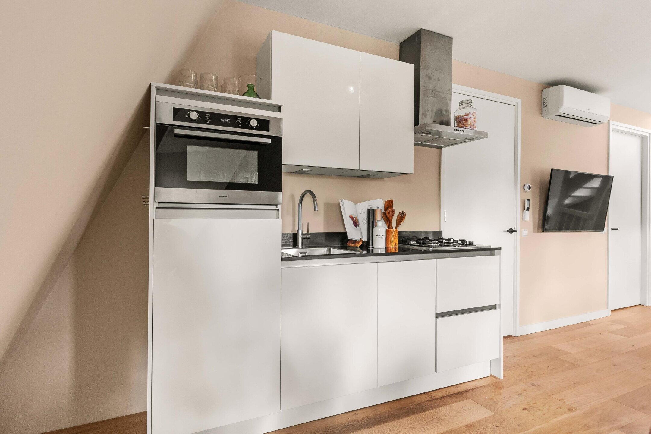 De open keuken is strak uitgevoerd en voorzien van diverse inbouwapparatuur, waaronder een koelkast, vriezer, combi-oven/magnetron en een gasfornuis met afzuigkap. De keuken is efficiënt ingedeeld en sluit naadloos aan op de leefruimte. Naast de keuken bevindt zich een praktische berging met aansluitingen voor wasmachine en droger, evenals de opstelling van de cv-installatie.