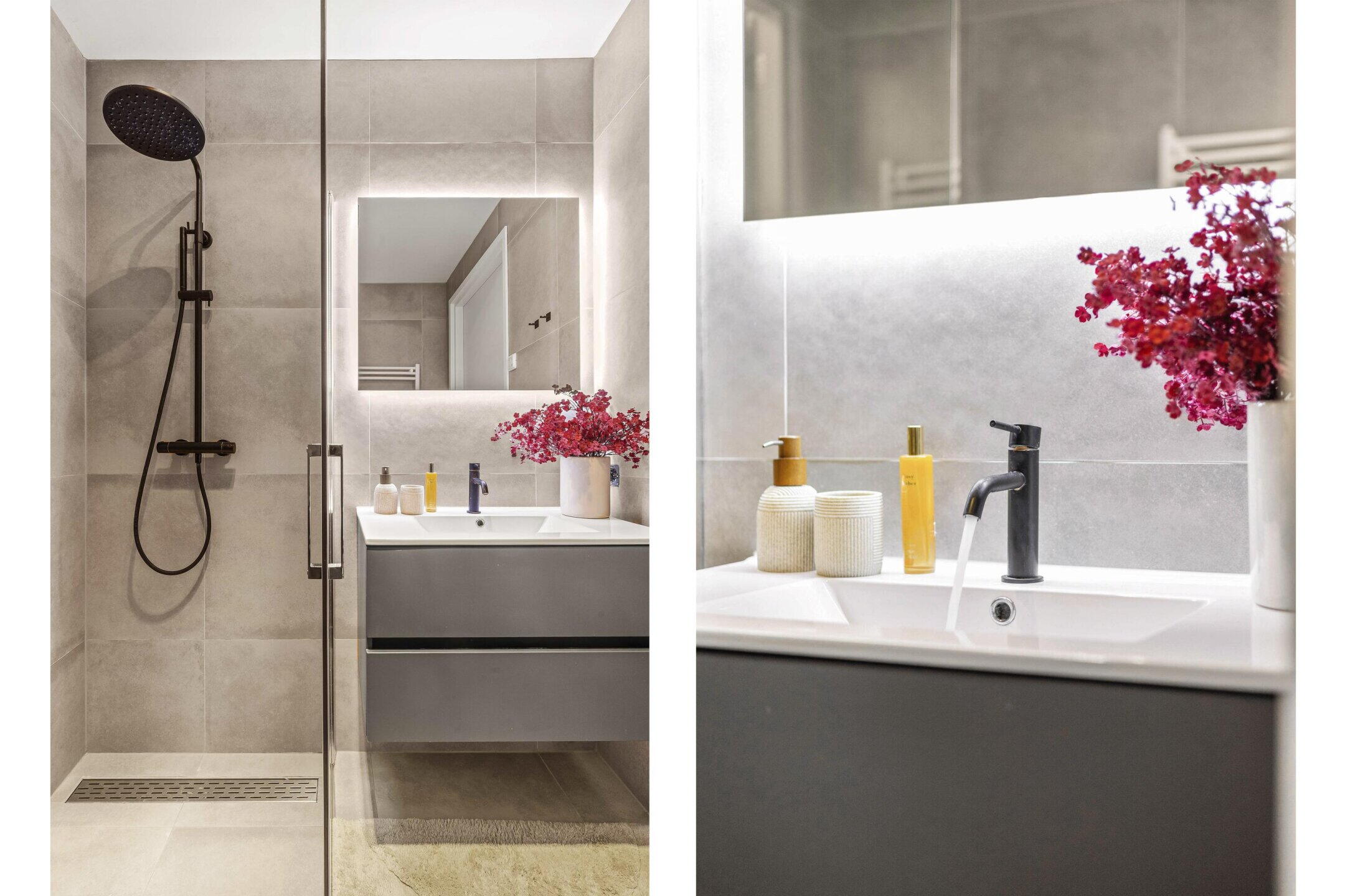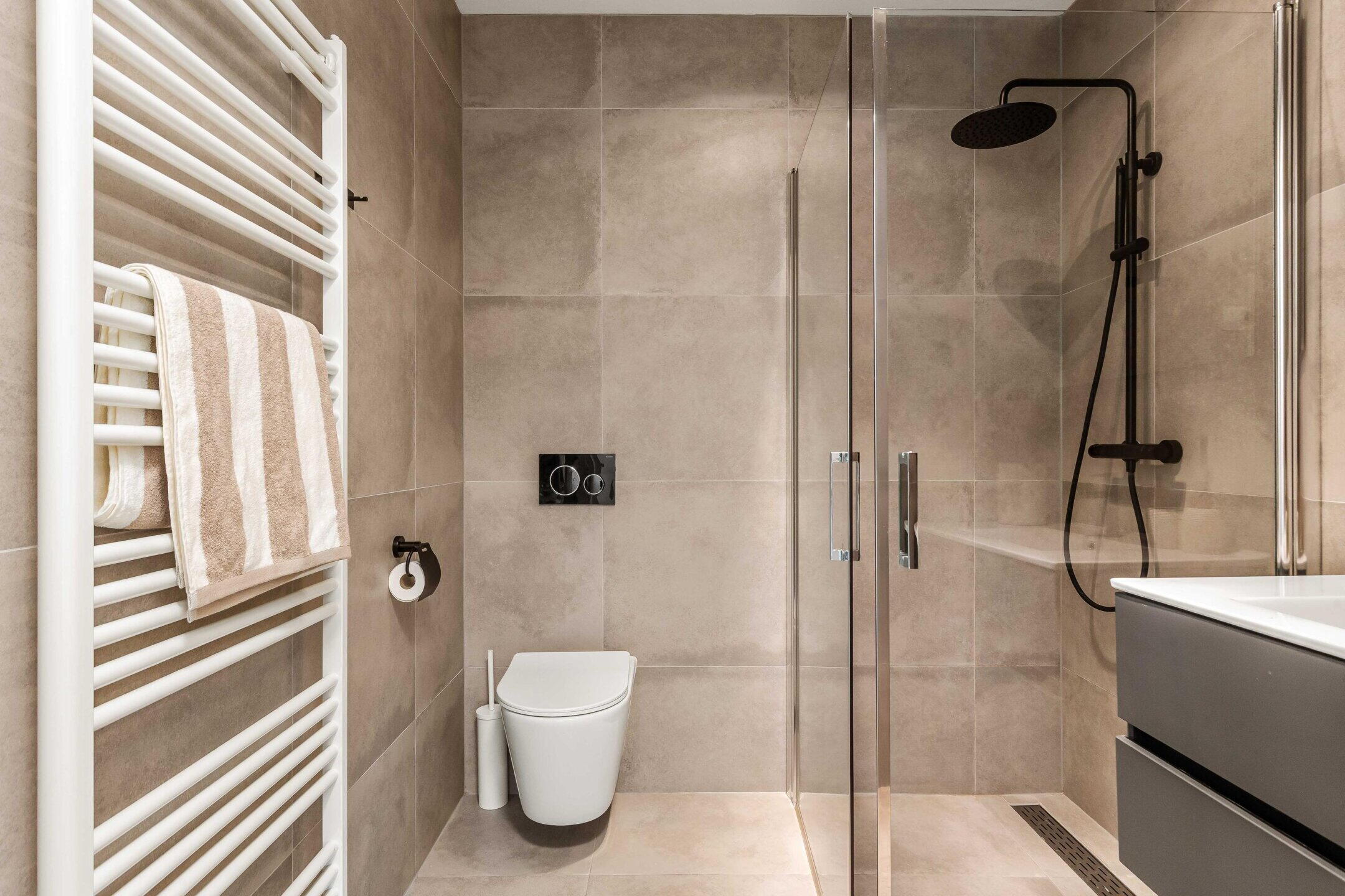 De moderne badkamer is stijlvol afgewerkt en beschikt over een ruime inloopdouche met regendouche, een wastafelmeubel en een hangend toilet. De combinatie van grote tegels en zwarte accenten geeft de ruimte een luxe uitstraling.