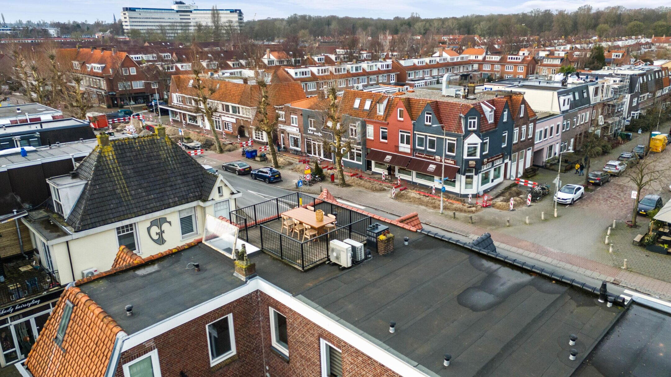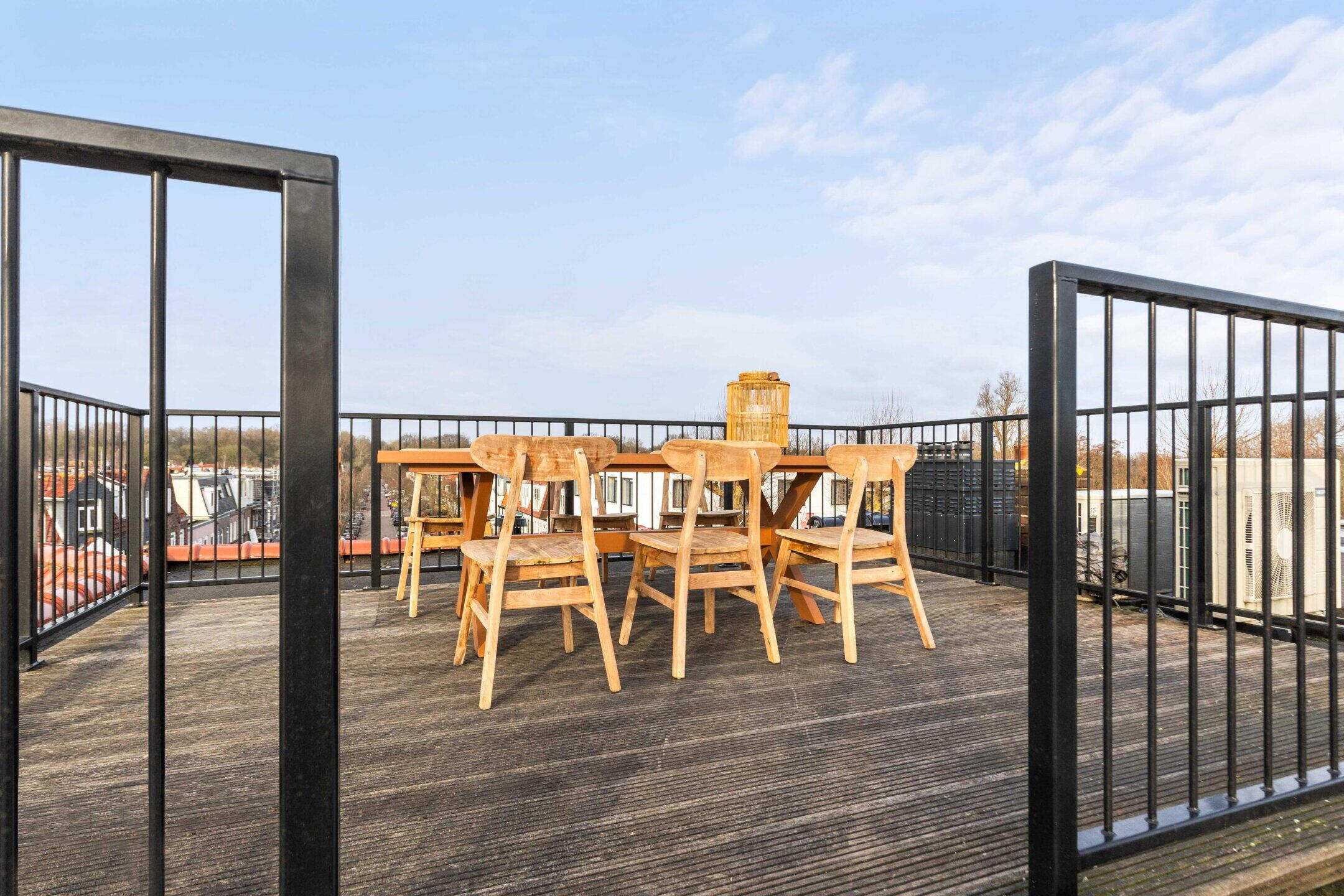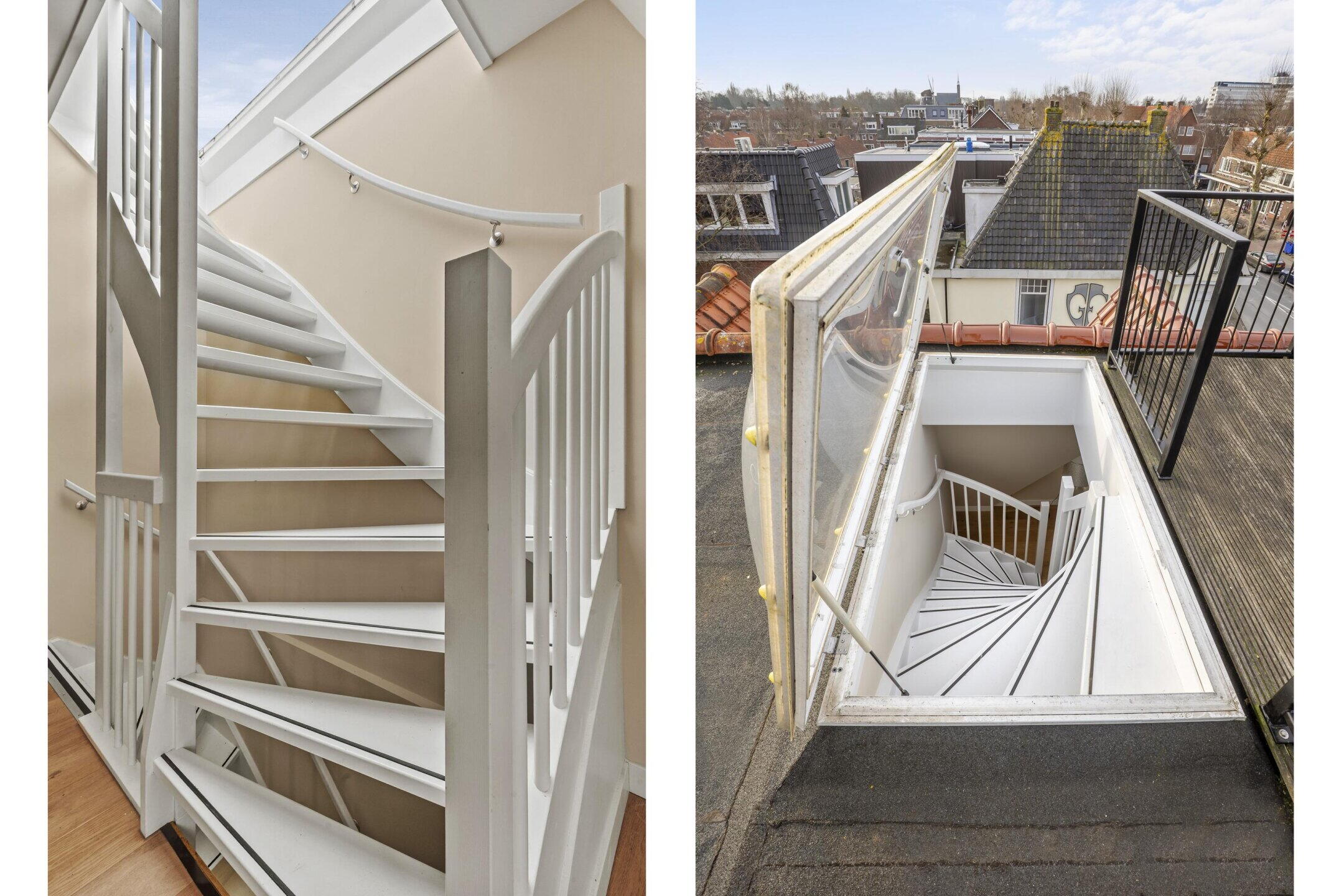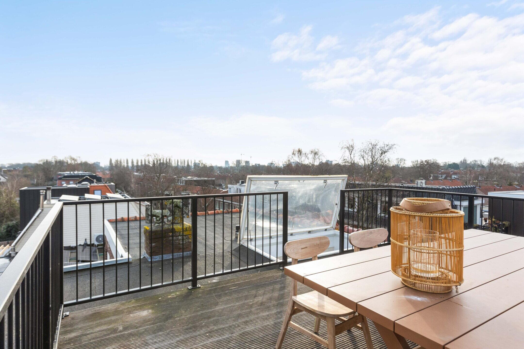 Via een vaste trap in de woonkamer bereik je het royale dakterras. Hier geniet je van een panoramisch uitzicht over de daken van Amstelveen. Het terras biedt volop ruimte voor een grote eettafel of loungehoek en vormt een heerlijke plek om te ontspannen en te genieten van de zon.