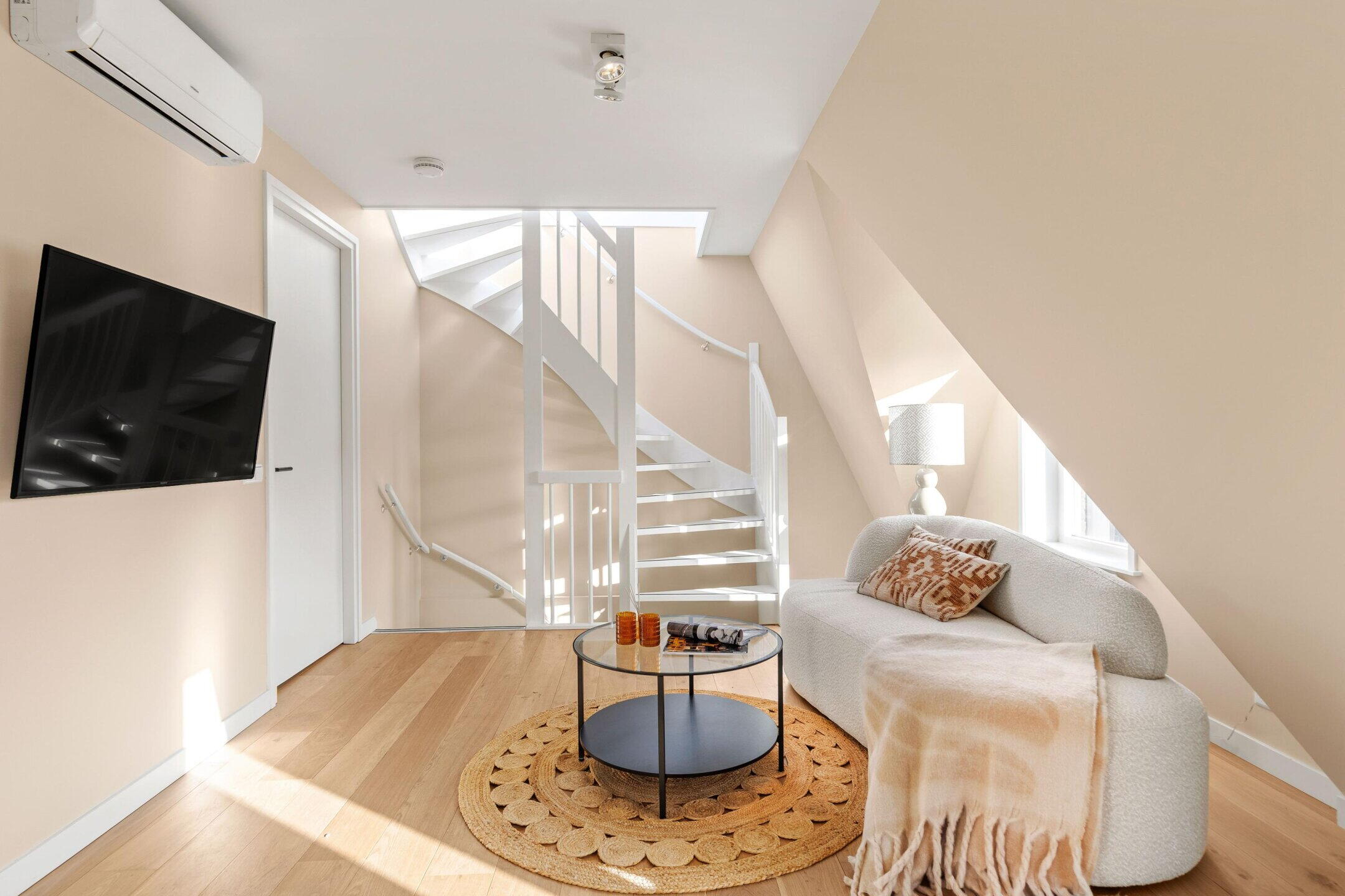 Via de gezamenlijke entree bereik je het trappenhuis naar het appartement op de tweede verdieping. Je komt binnen in de gezellige living, waar de schuine kapconstructie en de grote raampartijen zorgen voor een lichte en warme sfeer. Er is ruimte voor een comfortabele zithoek en een eethoek aan de voorzijde waar je met vier personen kunt dineren.
