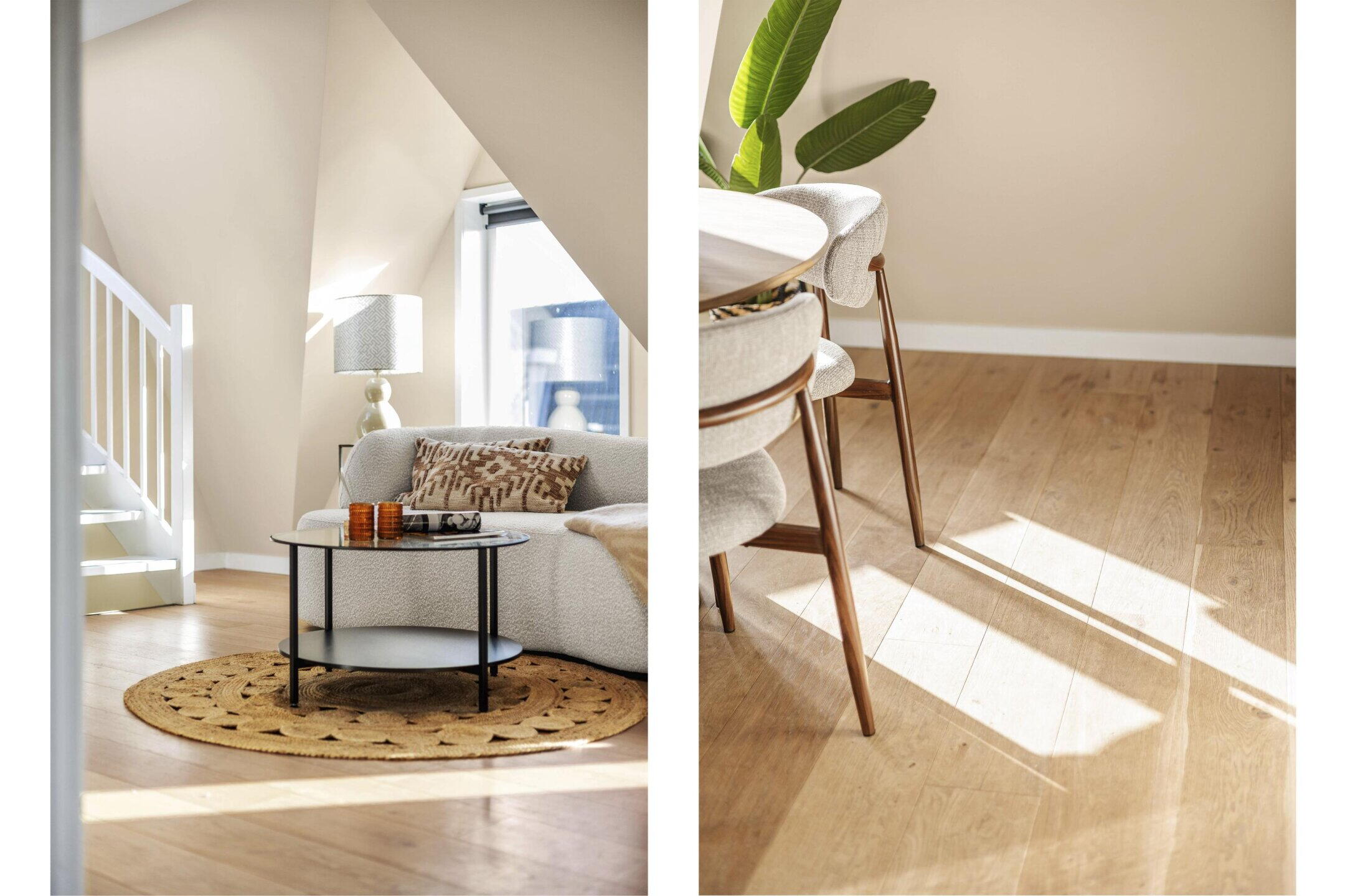 Through the shared entrance, you reach the staircase to the apartment on the second floor. You enter the cozy living room, where the sloping roof construction and large windows create a light and warm atmosphere. There is space for a comfortable sitting area and a dining area at the front where you can dine with four people.